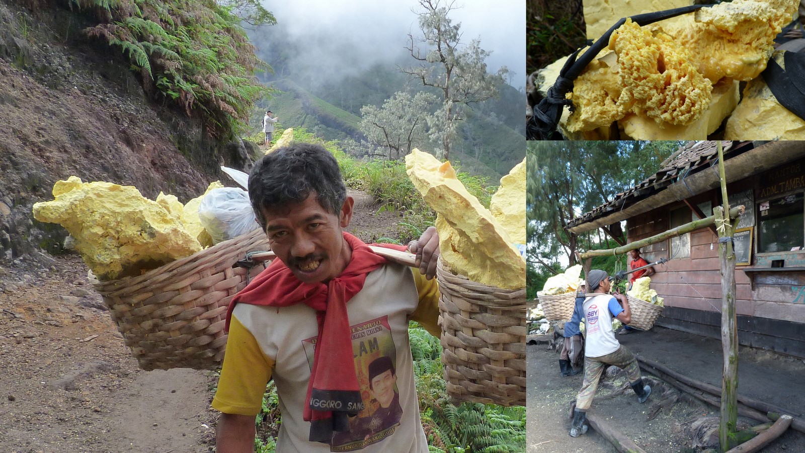Mỗi giỏ nặng trung bình 40 kg hoặc 80 kg cho mỗi chuyến đi. Trung bình họ làm cho hai chuển đi cho một ngày, nhưng một số những người trẻ hơn, có thể thực hiện 3 chuyển đi. Vai của họ hoàn toàn bị bóp méo bởi các vòng nặng trên vai của họ. Nhưng họ đủ nhiều lợ,để lựa chọn công việc này bởi vì nó được nhiều lợi nhuận hơn so với nông nghiệp. Một người chuyển chở lưu huỳnh được trả tương đương với 4,8 € cho 80kg lưu huỳnh, họ gánh lưu huỳnh đến xe tải đậu sẵn để chờ.
